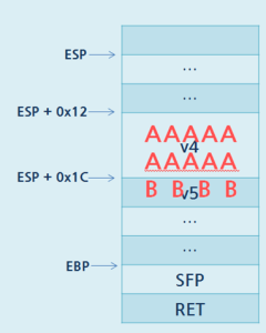 주석을 보면 main의 stackframe 기준으로 v4, v5 변수가 각각 스택의 어디에 있는지를 알 수 있다.