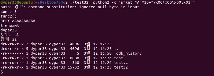 A*10 만큼 채우고 v5가 int형이니 4바이트 크기로 1을 넣어줬는데 쉘이 뜨지 않았다. 이렇게 왜 exploit 안됐는지 모르는 경우에는 gdb를 이용해서 동적 디버깅을 해보면 된다.