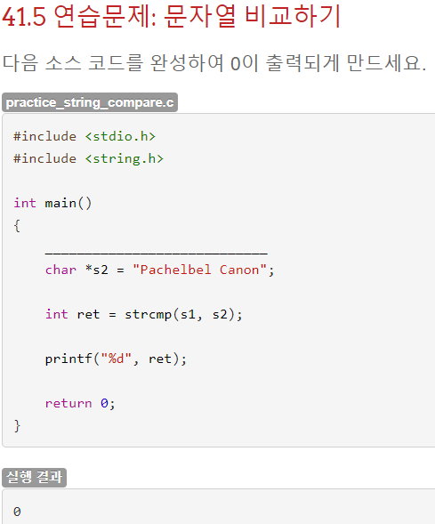 두 변수에 저장된 문자열은 같으므로(아스키 코드가 각각 같으므로) 0이 출력된다.