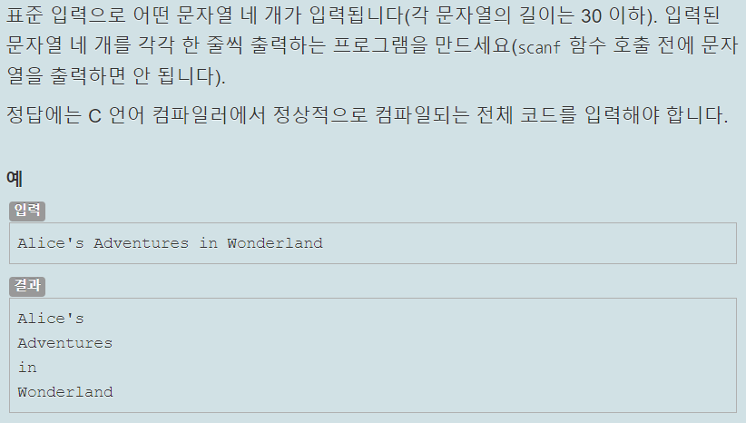 scanf("%s %s %s %s", s1, s2, s3, s4); // %s를 4번 써줘서 각 포인터에 입력받은 문자열 저장