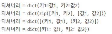 위에 적은것처럼 (변수이름) = {<키> : <값>, <키2> : <값>} 이렇게 딕셔너리를 생성하는 방법도 있지만 dict()로 생성할 수 있다.