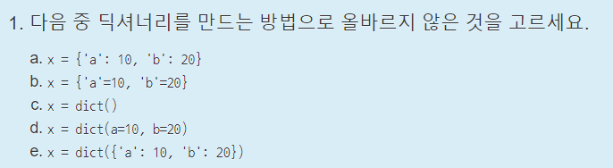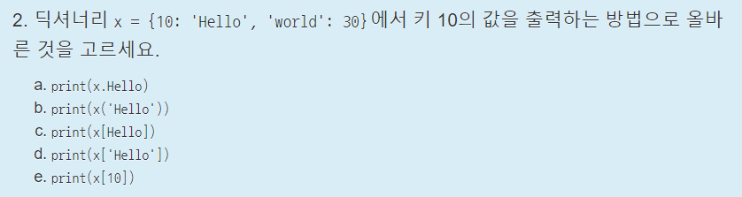 딕셔너리에서 특정 키의 값을 불러오는 방법은 변수명[키]로 해주면 된다. 따라서 키 x[10]을 해준 e가 맞다.