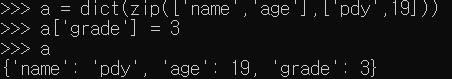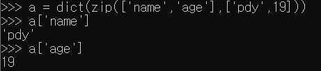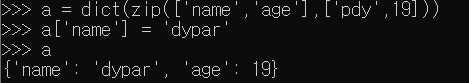 2번방법은 zip함수를 이용한 방법인데, 2번 방법을 사용한다면 키를 한번에 생성하고 값도 한번에 적을 수 있다.
