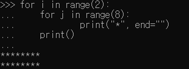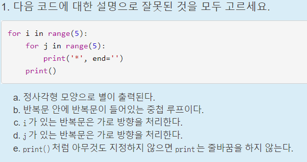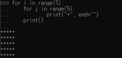 먼저 줄바꿈은 5번 수행되야하므로 첫번째 for문이 5번 반복하게 만들었고, 그다음에 별을 5개 출력해야하므로 두번째 for문은 5번 반복하게 한다. 출력은 공백없이 되야하므로 end="" 옵션도 넣어준다. 마지막으로 줄바꿈을 위해 print()도 넣어주는데, 중요한점은 두번째 for문 밖에다가 줄바꿈을 넣어줘야한다. 왜냐하면 두번째 for문 안에 넣는다면 별이 한줄로 찍히는게 아니라