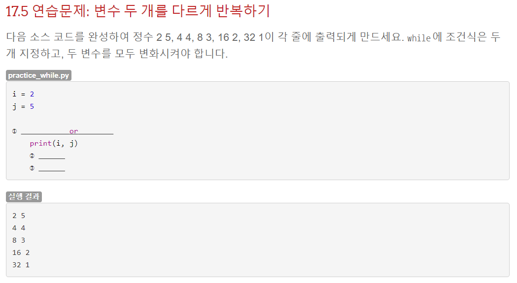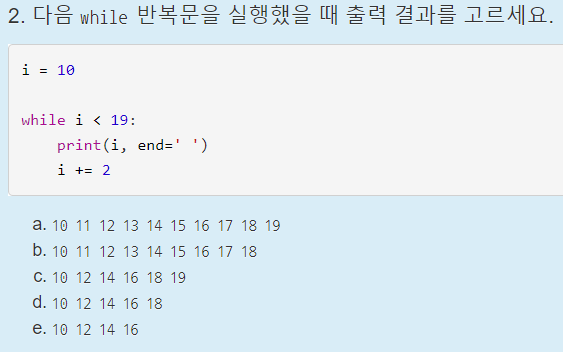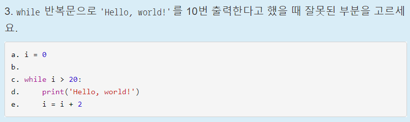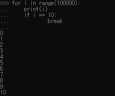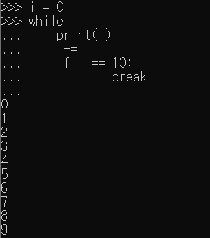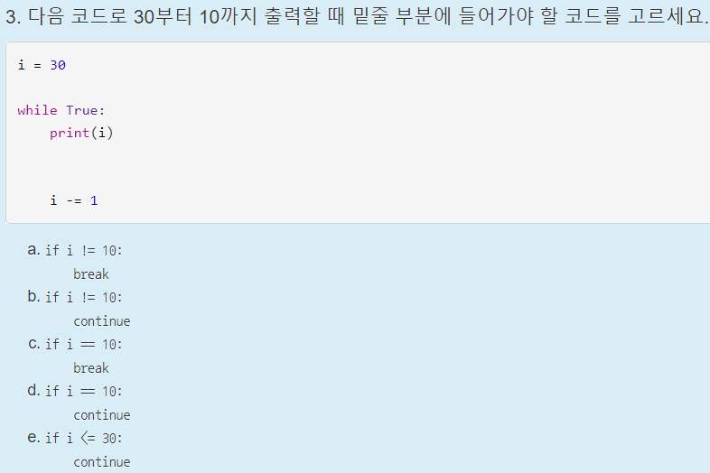 30부터 10을 출력하고 조건식보다 print 함수가 위에 있으므로 i가 딱 10이 됐을 때 break해주면 되겠다.