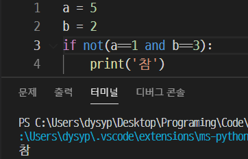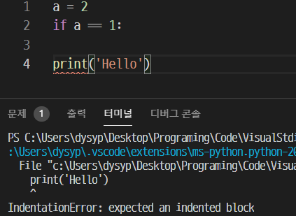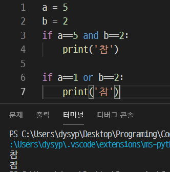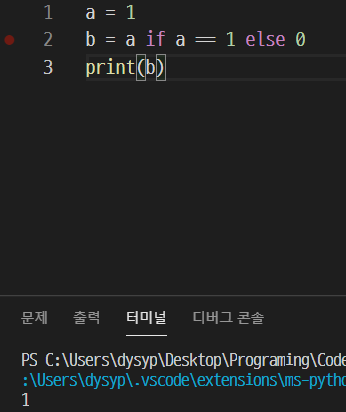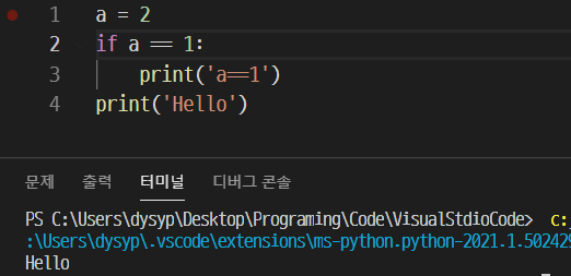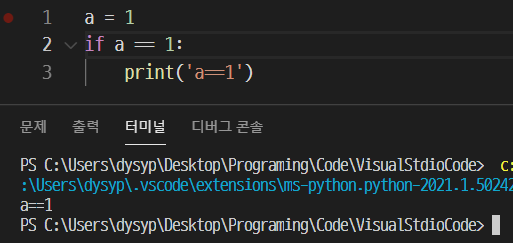 위 사진은 VSCODE를 통해 조건문을 구현해본 모습이다. 1행에서 a 변수에 1이 들어갔고, 2행에서 a == 1이라는 조건식이 있고, a == 1이 True라면 3행의 print('a==1')이 실행된다.