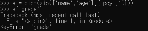 당연하지만 없는 키를 불러오려 시도하면 KeyError 오류가 뜬다.