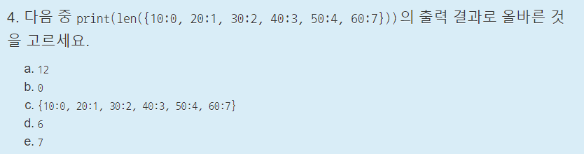 딕셔너리에 쓰이는 len 함수는 해당 딕셔너리의 키의 개수를 구해준다. 따라서 키의 개수인 6이 출력될 것이다.
