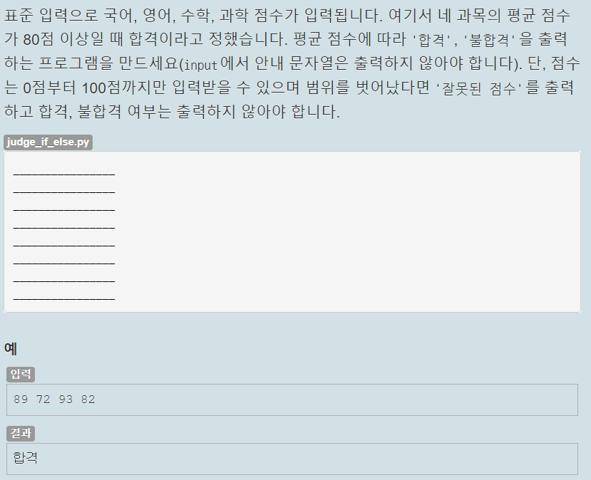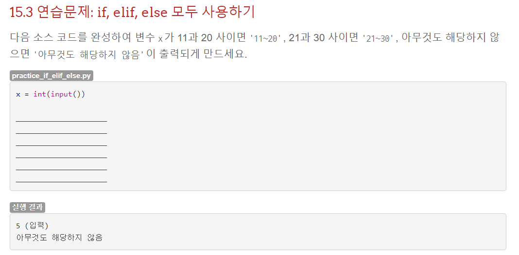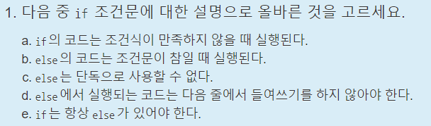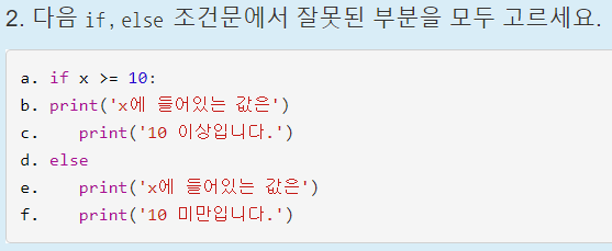 else는 if의 조건이 맞지 않을 시 실행하기 때문에 조건식은 필요 없지만 else 뒤에 ':'은 붙여줘야한다. 또한 조건이 맞지 않을 시 실행할 코드는 반드시 들여쓰기를 해줘야한다.