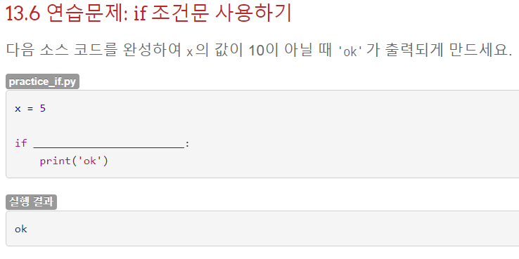 주어진 변수는 5가 들어있는 x가 있고, x의 값이 10이 아닐 때 ok가 출력되게 만들어야하므로 != 연산 기호를 이용해 조건식을 만들면 된다.