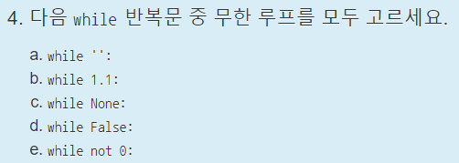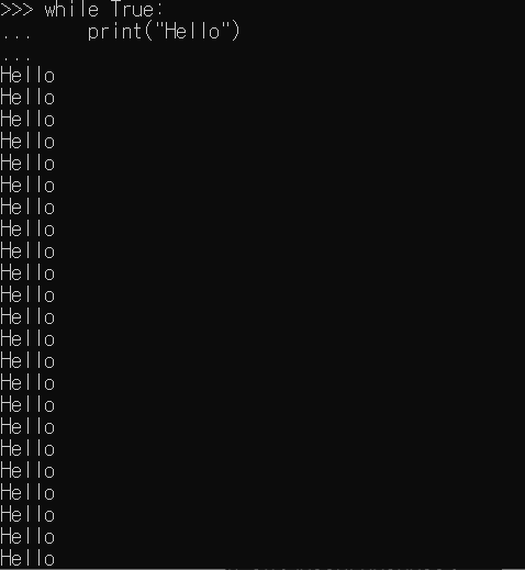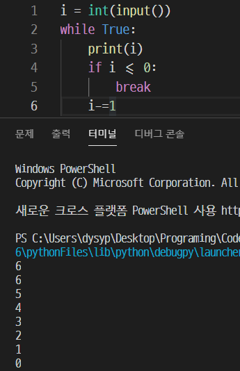 위 코드는 사용자에게 입력을 받고 그 횟수만큼 반복해주는 반복문이다. 조건식은 True로 두고 무한루프로 설정한 다음