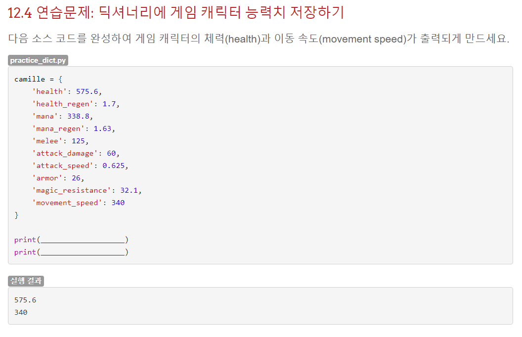 체력, 이동 속도를 출력되게 해야한다. 이 값들은 딕셔너리에 저장되어 있는데, 각각의 키는 'health', 'movement_speed'다. 그러면 딕셔너리 이름인 camille와 키값으로 값을 출력할 수 있다.