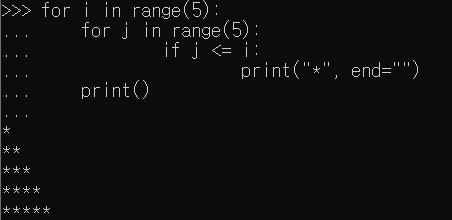 i가 1일 때 1행이므로 별이 한개 출력되야한다. 그러므로 if j <= i : 로 조건을 걸어준다면 각행에 출력될 별의 개수보다 j가 작다면 *을 찍어주므로 위와 같이 결과가 나올 것이다.