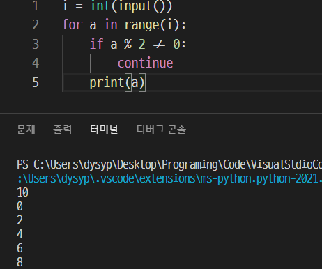 위 코드는 마찬가지로 입력을 받고 그 숫자까지 짝수에 해당하는 수를 출력한다. while로도 가능하지만 for문으로 구현했고 a % 2 != 0일시 홀수이므로 continue를 써주었다.