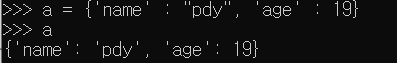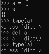 빈 딕셔너리는 위 사진처럼 {}만 써주거나, dict()를 입력해준다면 값이 빈 딕셔너리가 생성된다.