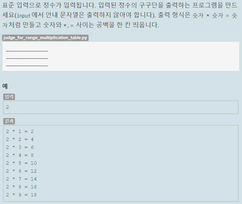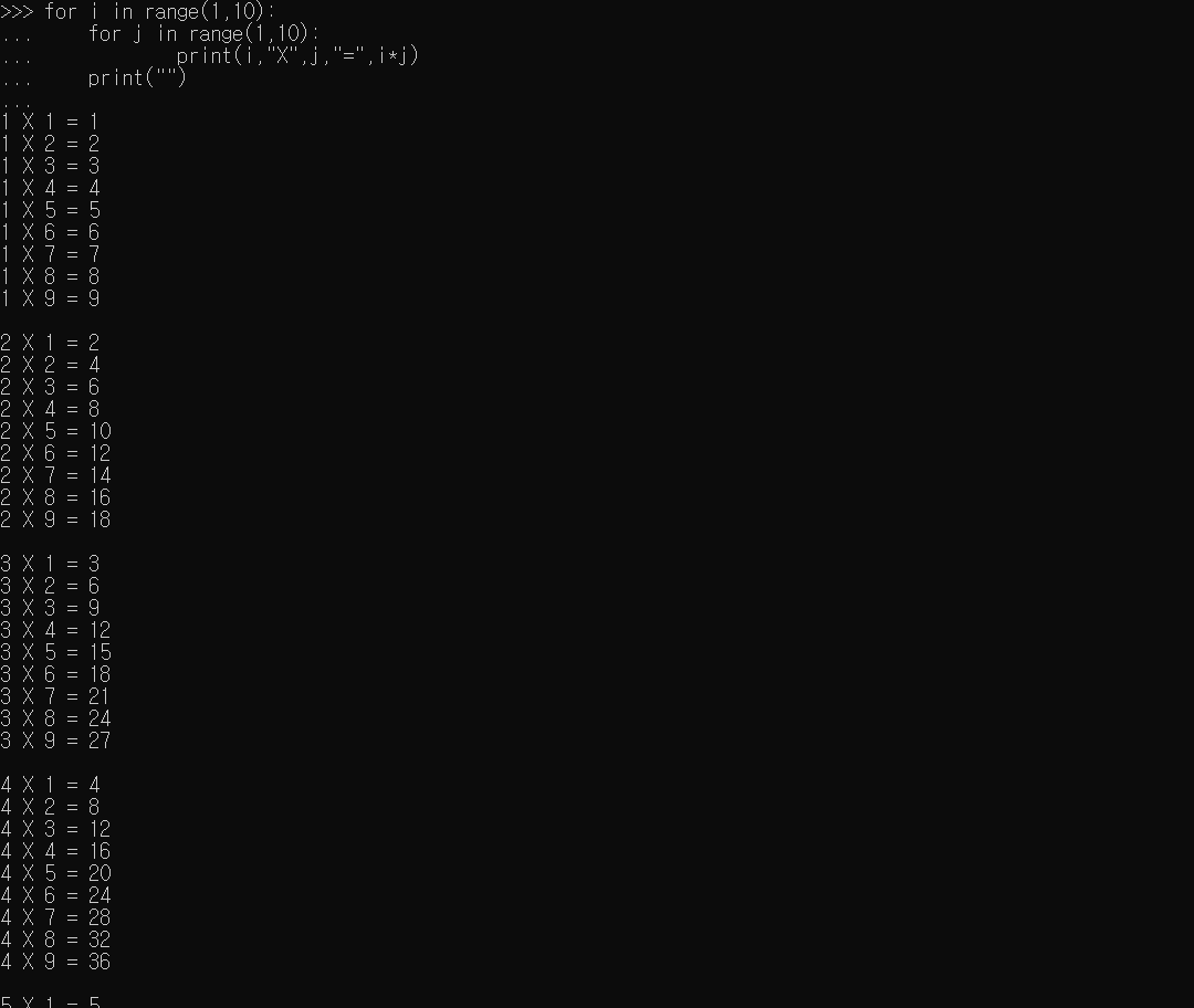 위는 for문 두개를 이용해서 구구단을 출력해보는 코드다. 맨 처음 for문은 i in range(1,10)으로 설정해 1~9의 값이 i에 들어가게 하고 2번째 for문은 i에 곱해줄 값인 1~9를 역시 range를 통해 j에 넣어준다. 첫번째 for문이 한번 반복될 때 두번째 for문은 9번 반복하는데, 이를 이용해서 i * j로 구구단을 출력해주는 것이다.