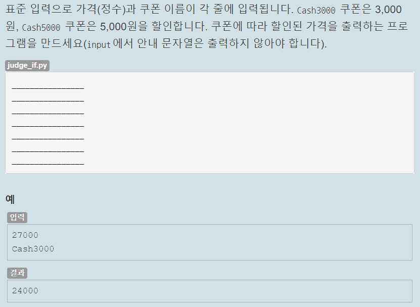 가격과 쿠폰 이름이 입력되는데, 쿠폰 Cash3000은 3000원을 할인해 주고, 쿠폰 Cash5000은 5000원을 할인해준다. 이를 감안해서 할인이 적용된 각격을 출력하면 된다.