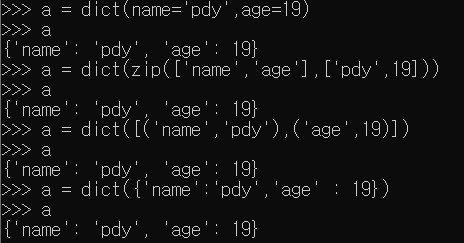 3번 방법은 튜플을 사용한 방법인데, 그냥 딕션너리를 생성하는 것과 비슷하게 1번째는 키, 2번째는 값을 적어주면 된다.