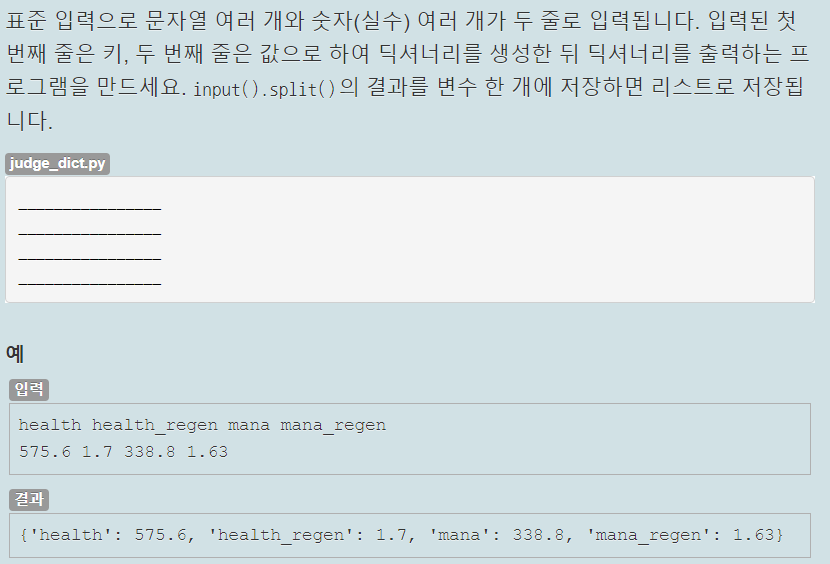 입력된 첫번째 줄은 키, 두번째 줄은 값에 해당된다. 키는 키끼리, 값은 값끼리 한번에 저장되므로 dict()와 zip()로 딕셔너리를 생성하면 될 것 같다. 또한 값은 실수로 저장해야하므로 map을 이용해서 float로 형변환을 해줘야한다.