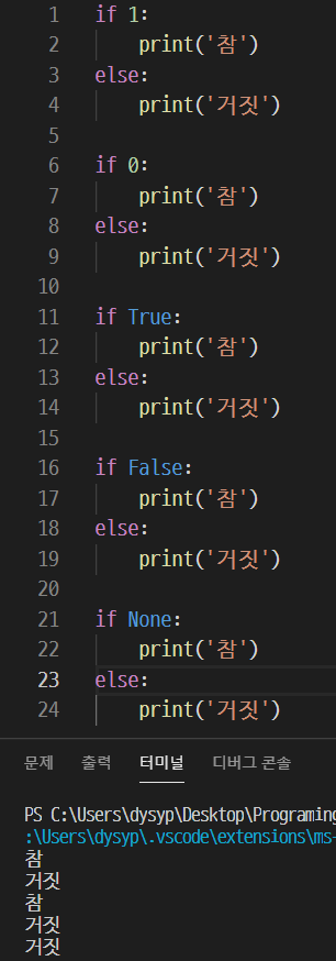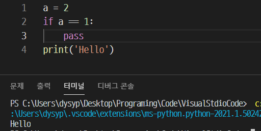 조건식이 참일 시 실행할 코드를 적지 않는다면 위 사진처럼 pass를 적어준다면 이 사진 위의 사진처럼 오류 없이 실행이 가능하다.