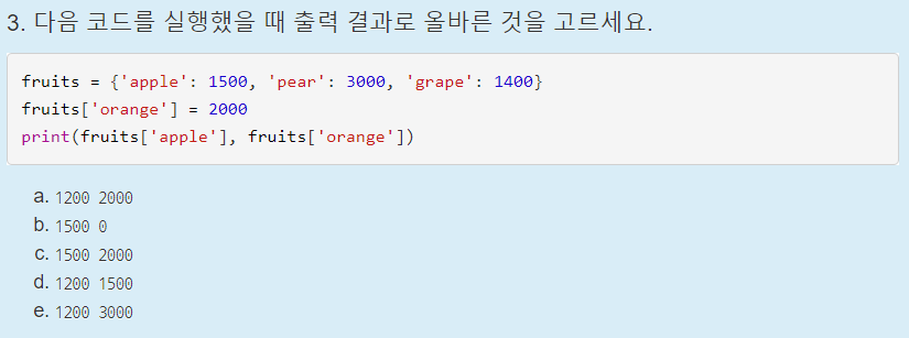 1행은 딕셔너리를 만들어주는 코드. 2행은 orange라는 키가 존재하지 않으므로 orange 키를 추가하고 2000 값을 넣어준다. 3행은 apple, orange 키에 해당하는 값을 출력하는 명령이다. 따라서 apple과 orange에 해당하는 값이 1500, 2000이 출력된다.