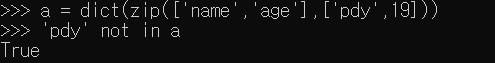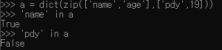 시퀀스 객체를 공부할 때 in 함수에 대해 배웠었다. in은 해당 시퀀스 객체에 특정 값이 있으면 True 없으면 False를 반환하는 함수인데, 이 함수를 딕셔너리에도 사용할 수 있다.