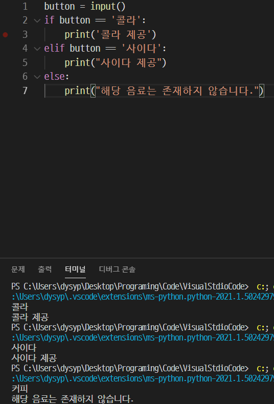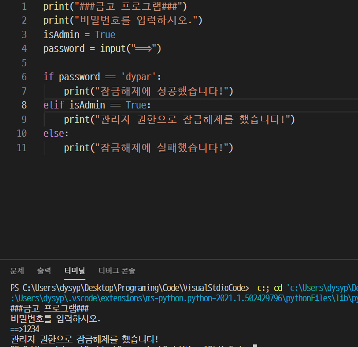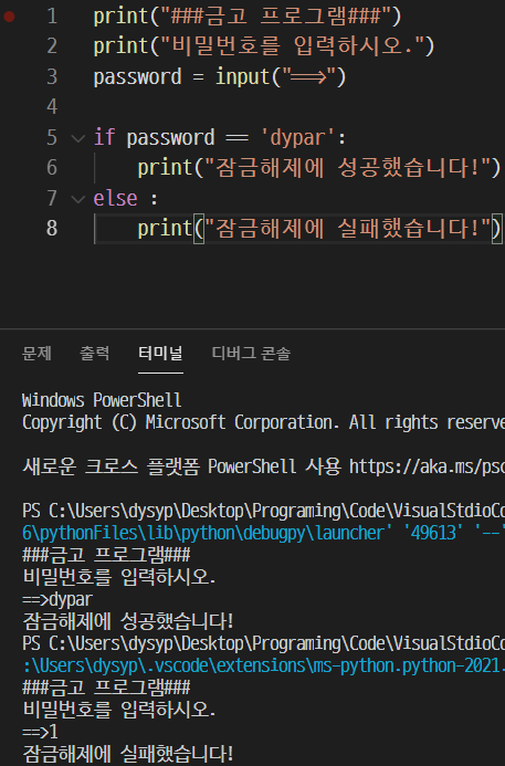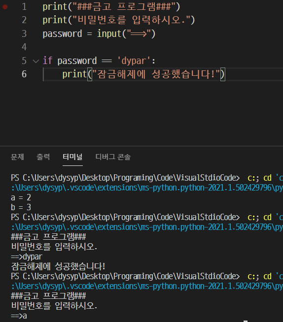 위는 간단하게 금고 프로그램을 조건문 if를 이용해 구현해본 사진이다. 1,2행은 ###금고 프로그램###, 비밀번호를 입력하시오.를 출력하고 3행에서 input 함수로 사용자가 입력한 값을 str 형태로 받아온다. 그리고 5행에서 입력 값이 dypar인지 확인을하고 맞다면 6행 잠금해제에 성공했습니다!를 출력해준다.
