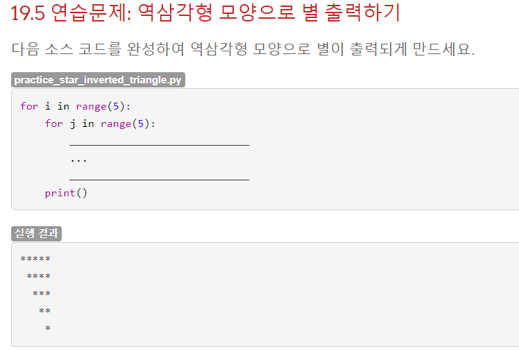 실행 결과가 위처럼 나오려면 일단 별출력과 공백 출력을 2번째 for문에서 if문으로 분기해서 처리하면 될 것 같다.