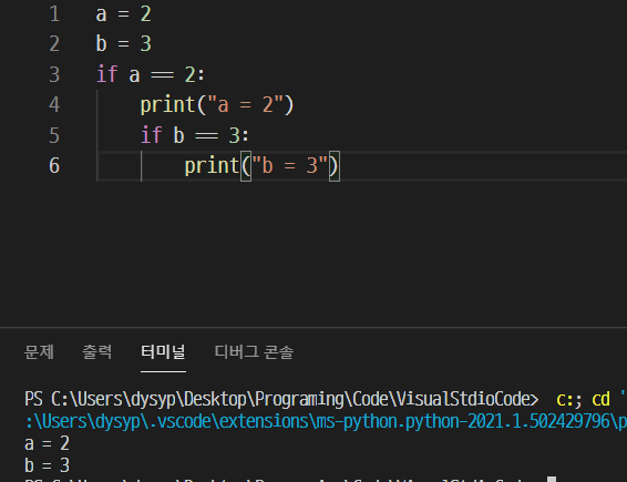 1,2행에서 a,b에 각각 2와 3을 넣어줬고, 3행에서 a == 2인지 조건 만족 여부를 확인한다. 만약 만족할시 4행의 print()가 실행되고 그 다음에 b == 3인지 조건 만족 여부를 확인하는 2번째 if문이 나온다. 이 if문 역시 일반 if문과 똑같이 조건에 만족한다면 if 안의 코드를 실행하는 역할을 한다. 다만 중요한점은 중첩 if를 써줬다면 중첩 if 조건이 맞을시 실행하는 코드는 한번 더 들여쓰기를 해줘야한다. 즉 2번 들여쓰기를 하는 것이다.