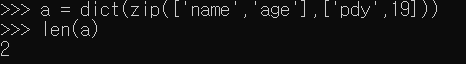 len 또한 사용이 가능하다. 딕셔너리에서 len을 사용한다면 키의 개수를 구할 수 있다.
