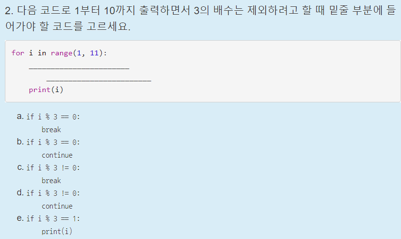 3의 배수는 3으로 나눴을 때 나머지가 0이므로 if i % 3 == 0 : continue로 짜주면 된다.