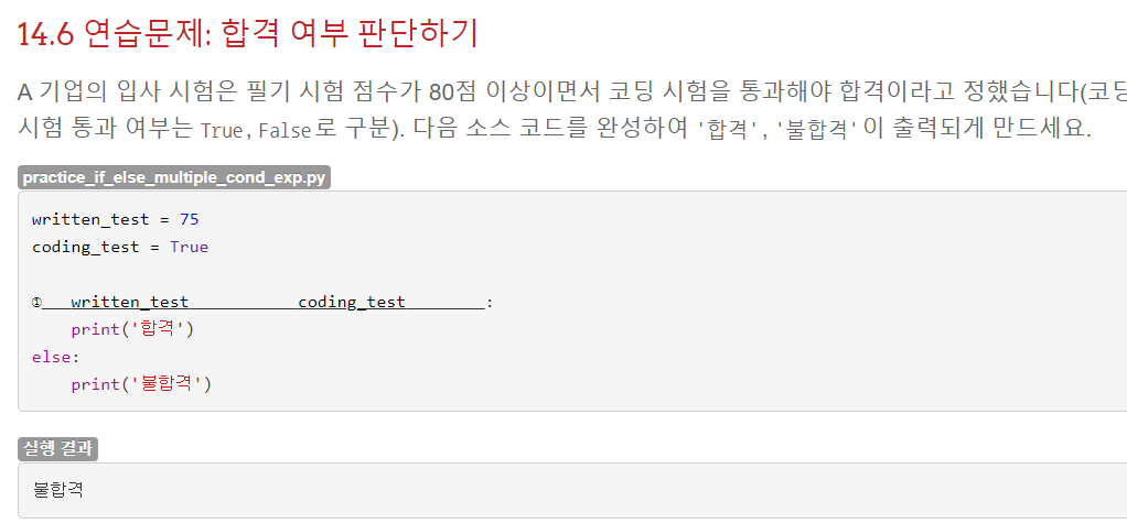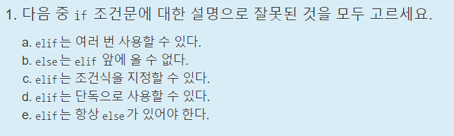 조건식 부분에는 전에 사용했던 부등호, ==, !=, 시퀀스 객체의 경우 in, not in 등 참과 거짓을 구분하는 모든 식을 사용할 수 있다. 식 뒤에는 :를 붙여줘야한다. 중요한 것은 초기에 들여쓰기 파트에서 배웠던 것처럼, <조건에 만족할시 실행할 코드>는 반드시 들여쓰기를 해줘야 한다. 만약 들여쓰기를 안해준다면 오류가 뜬다. 또한 한 if 내의 코드들은 들여쓰기 공백 칸 수가 모두 동일해야하고 들여쓰기를 안해준다면 그 코드는 if 조건문 밖의 코드로 해석한다.