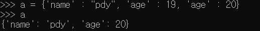 위 사진처럼 name에 해당하는 값 pdy, age에 해당하는 값 19, 이런식으로 값에 이름(key)를 붙여서 값들을 저장할 수 있다. 물론 저 이름을 이용해 이름에 해당하는 값을 불러올 수도 있다. 또한 리스트, 튜플과 마찬가지로 다른 자료형들도 섞어서 사용할 수 있다. 단 키에는 리스트, 튜플의 사용이 불가하다.