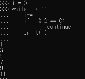 위 코드는 i가 홀수일때만 print해주는 코드다. i < 11이라는 조건식을 새워서 10번 반복되게 하고, if i % 2 == 0: 이 조건식은 i가 짝수인지 확인하는 역할이다. i가 짝수라면 2로 나눴을 때 나머지가 없으므로 continue로 반복문 시작지점으로 올리는 것이다. 따라서 실행결과는 i가 홀수인 경우만 출력되므로, 홀수만 출력된다.