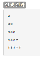 2번째 목표는 위 사진처럼 계단식으로 별을 출력하는 것이다. 앞에서 별을 중첩 루프로 찍은 것처럼 위 결과도 중첩 루프를 사용한다면 풀 수 있을 것 같다.