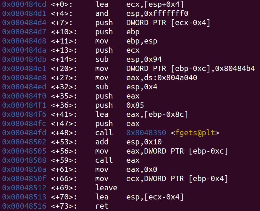 main+56, main+59 : 0xffffcffc(ebp-0xc)에 저장돼 있는 값 0x80484b4를 eax 레지스터에 넣은 후 call eax. 즉 0x80484b4 주소의 함수를 실행