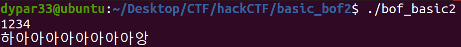 리눅스 환경에서 실행해보니, 어떤 입력 값을 넣어도 "하아아아아아아아아앙"이 출력되는 것을 볼 수 있다.