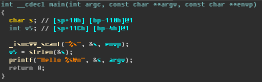 char형 변수(배열로 추정) s, int형 변수 v5를 선언하고 scanf 변수를 통해 문자열을 입력 받은 후, v5는 s의 문자열 길이를 담고, printf 함수를 사용해 Hello <s의 문자열> 형식으로 출력해준다.