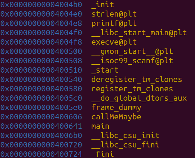 일단 여러번 gdb로 열어봤지만 주소가 안바뀌는 것을 보아 aslr을 걸려있지 않다. callMeMaybe 함수의 주소인 0x0000000000400606을 bof를 통해 ret에 넣어주면 되겠다.