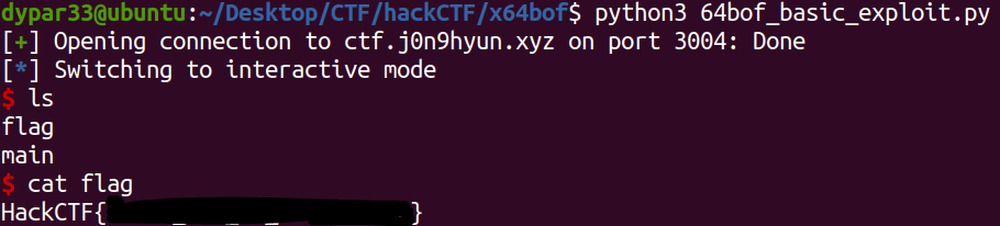 s 변수에서 ret까지 거리가 268(11c - 10, s와 v5의 거리) + 4(v5의 크기 int) + 8(sfp, 64bit 환경이므로 8byte다.) = 280이다. 따라서 280만큼 더미 값으로 채워주고 callMeMaybe 함수의 주소인 0x0000000000400606를 p64 함수로 64bit 리틀 엔디안으로 패킹해서 payload를 생성한 후 sendline을 통해 전송하면 된다.