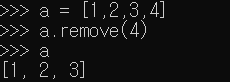 위 처럼 remove(<값>)을 입력하면 해당 값을 리스트에서 찾아 삭제해준다.