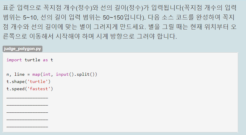위 코드는 360 / (도형의 각 수)를 해주면 그 도형의 외각의 크기가 나온다는 점을 이용해 사용자로 부터 입력을 받아서 원하는 각의 도형을 그려준다.