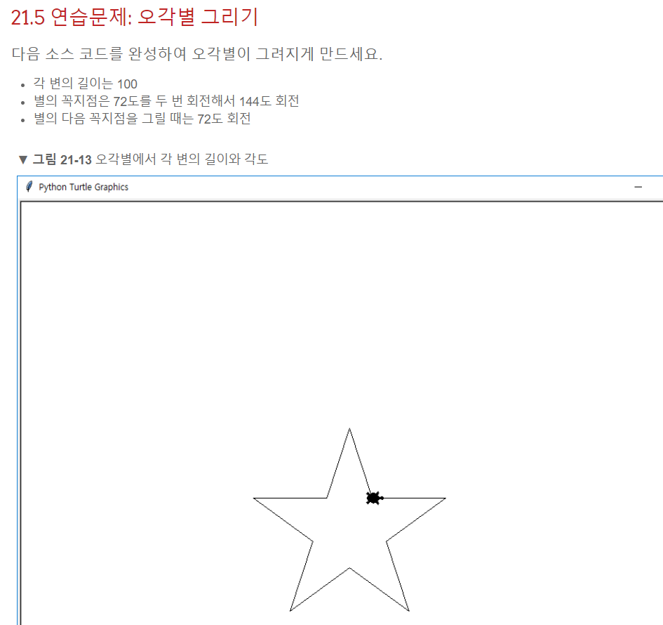 위는 오각형을 만들어주는 코드다. 6행을 보면 right(360/5)를 써줬는데, 360 / (도형의 각 수)를 해주면 그 도형의 외각의 크기가 나온다는 점을 이용한 것이다.