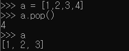 위 사진처럼 pop 명령어를 사용한다면 리스트의 마지막 값이 출력되고 삭제된 것을 볼 수 있다.