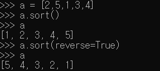 위 사진은 1,2,3,4,5 값들을 순서를 바꿔서 a 변수에 넣어준 모습이다. 그 상태에서 sort 함수를 쓰니 값들이 내림차순으로 자동 정렬되는 모습을 볼 수 있다. 또한 sort에 reverse=True 옵션을 주면 오름차순으로 정렬을 해준다.