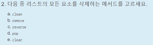 리스트의 모든 요소를 삭제하는 메서드는 clear다. 답 : e