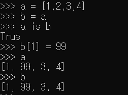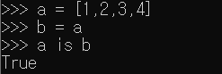 위 코드는 a에 1,2,3,4 값을 넣고 b에다가 a를 넣어준 모습이다. 그 결과 is를 써봤을 때 두 객체는 같다는 결과가 나왔다.