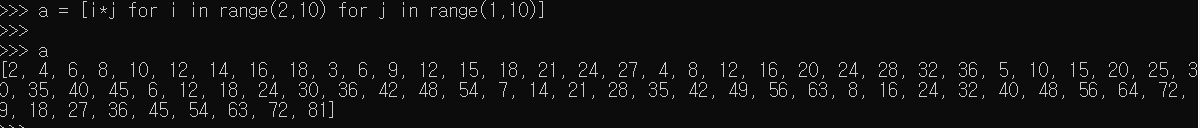 위의 경우 range로 생성되는 값들을 하나씩 뽑아 i에 넣어주고 그 다음 j in range(1,10)으로 생성되는 숫자들을 i에 하나하나 곱해주는 방식으로 구구단을 출력해준다.