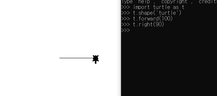 right 명령어를 실행시키니 위 사진처럼 거북이의 방향이 90도 만큼 오른쪽으로 꺽였다.