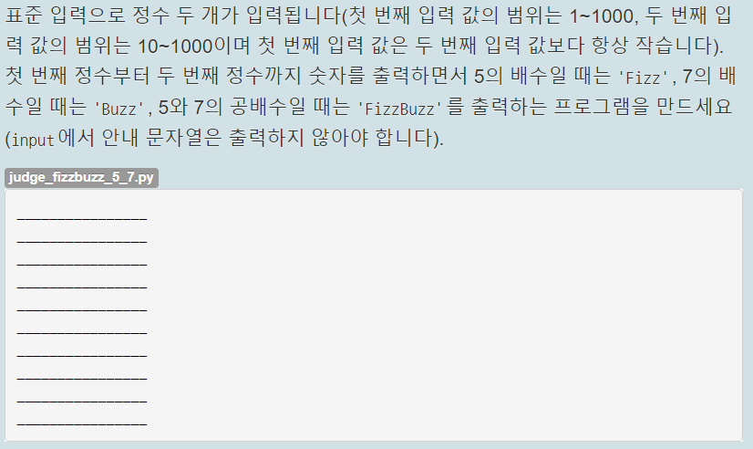 3, 5의 배수, 공배수일때 각각 Fizz, Buzz, FizzBuzz를 출력하는 FizzBuzz문제를 변형시킨 것이다. 위의 FizzBuzz 문제 풀이 방식과 비슷하게 각 조건문의 빈칸을 채우면 된다.
